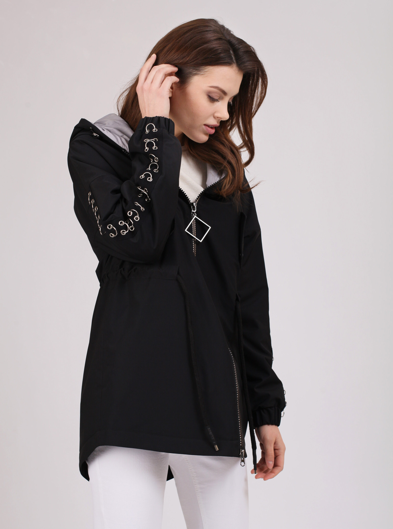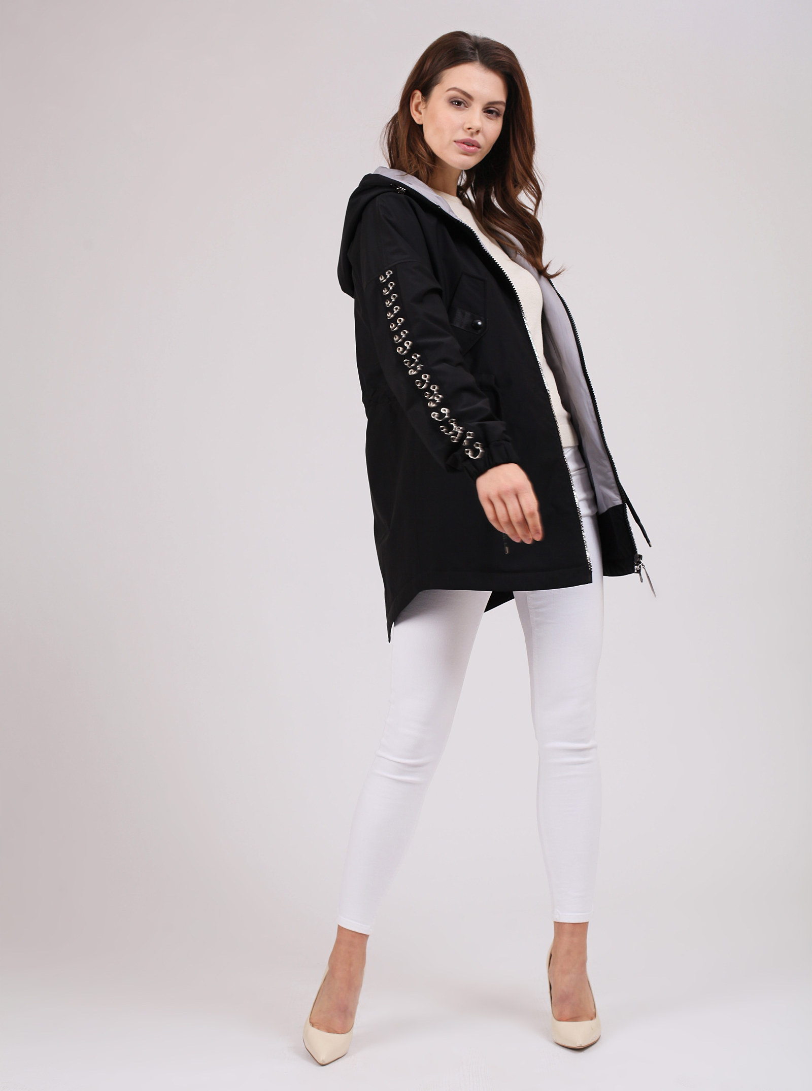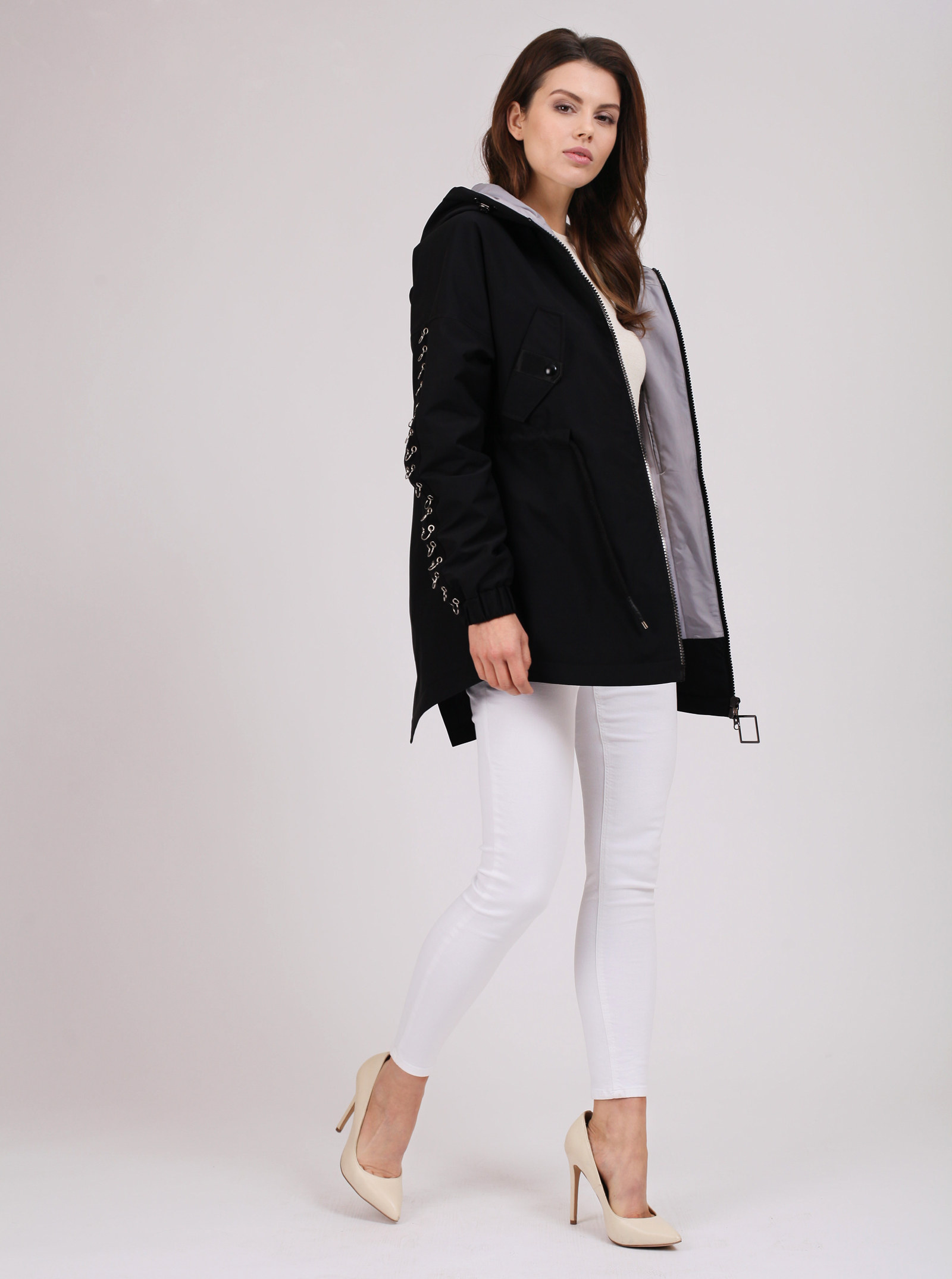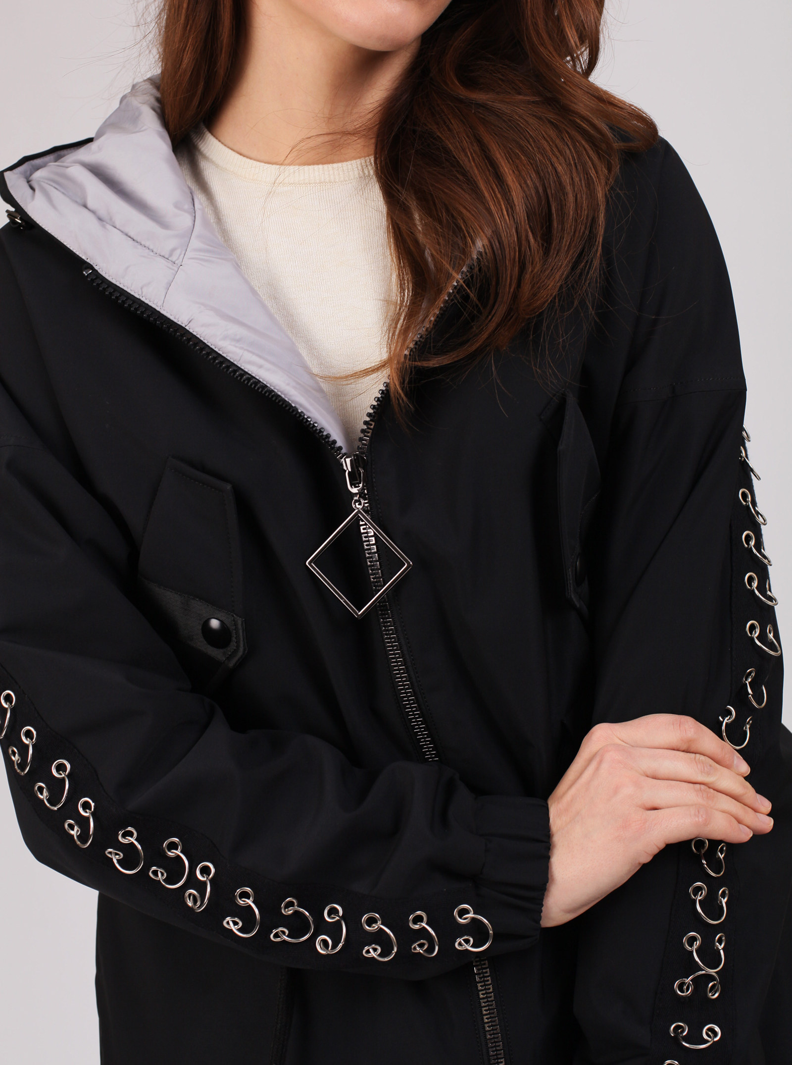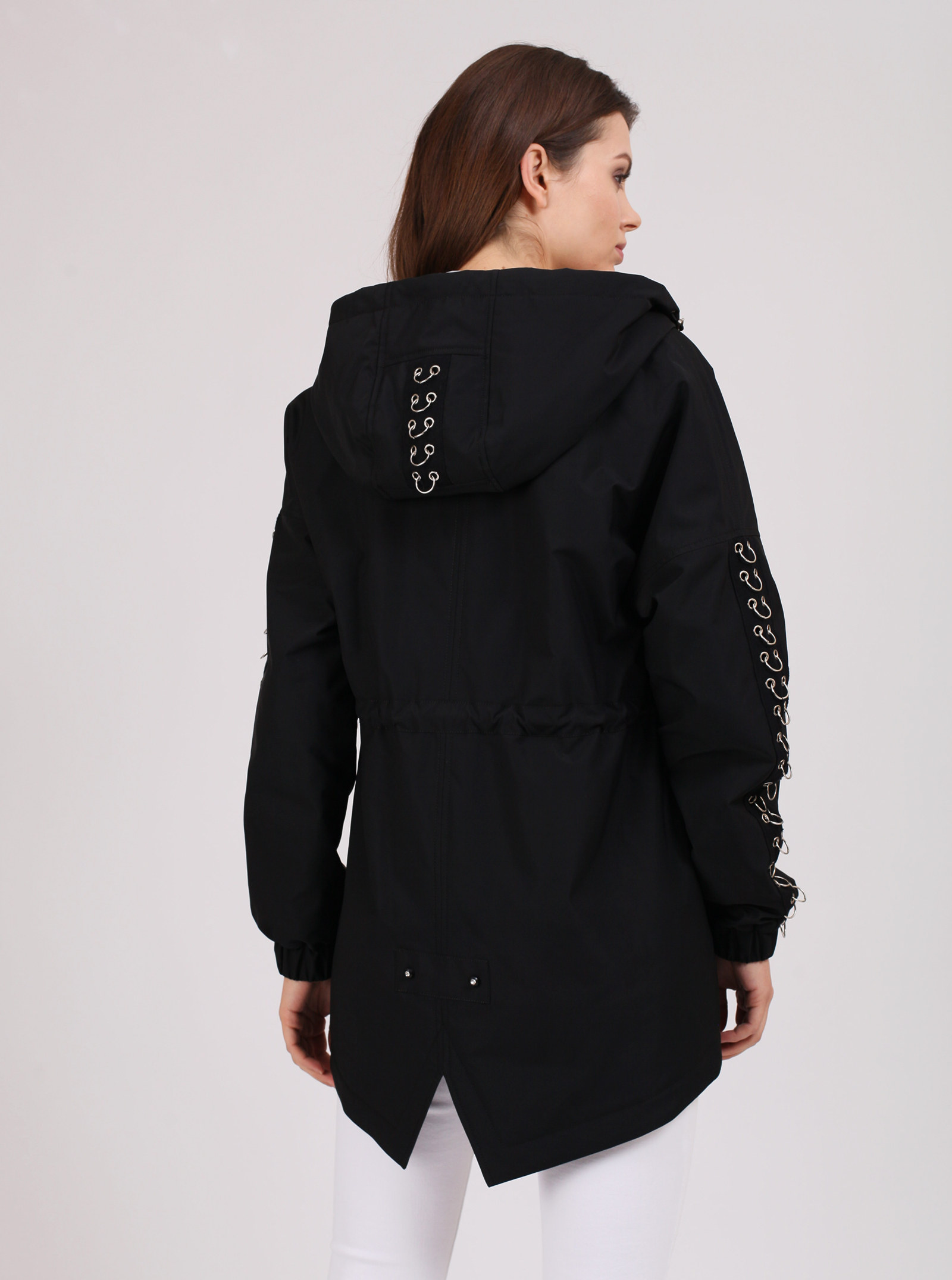 Куртка-парка на тонкой утепленной простеганной подкладке контрастного цвета с цельнокроеным капюшоном. Ее приталивание достигается при помощи объемного шнура, степень прилегания фиксируется узлом. В качестве отделки используется широкая лента в тон ткани с многочисленными люверсами и кольцами. Она располагается вдоль середины рукава и на вставке капюшона. Дизайн пуллера в форме квадрата a также блестящая молния придают изделию экстровагантность.
