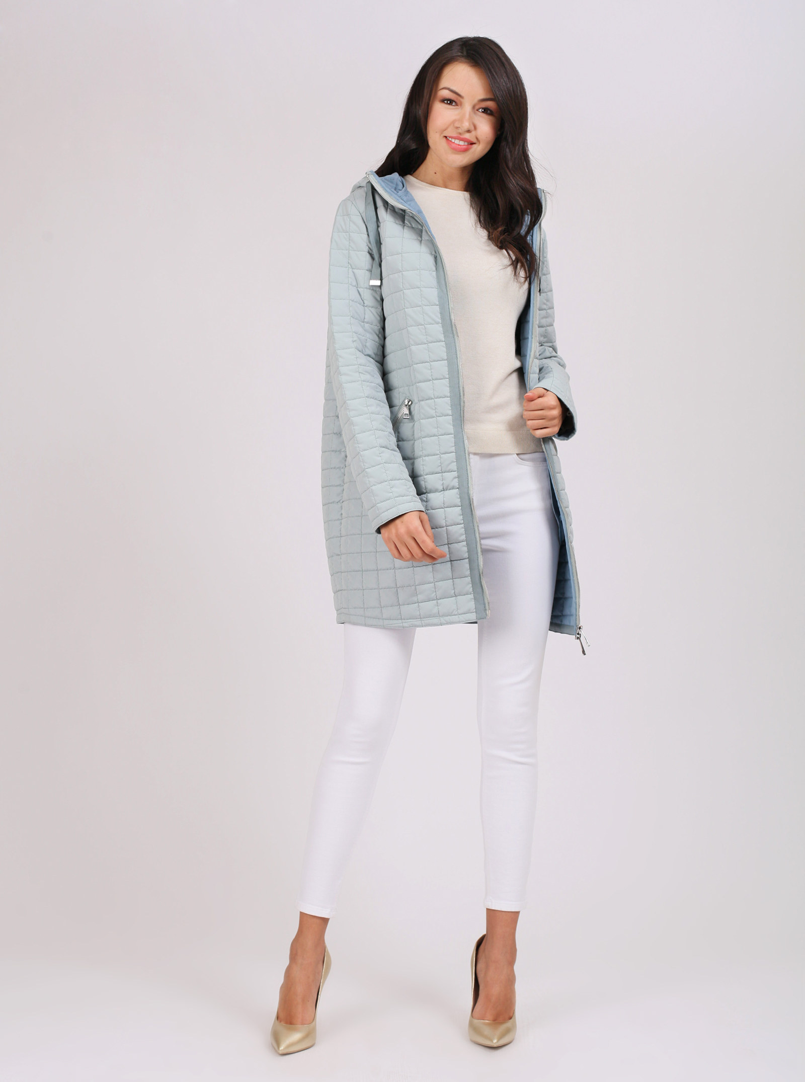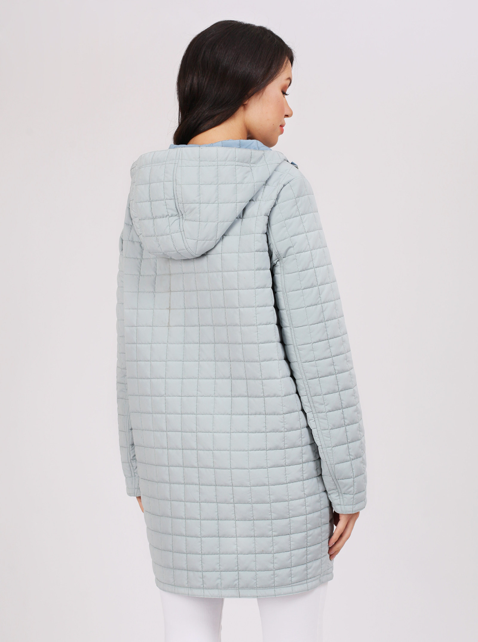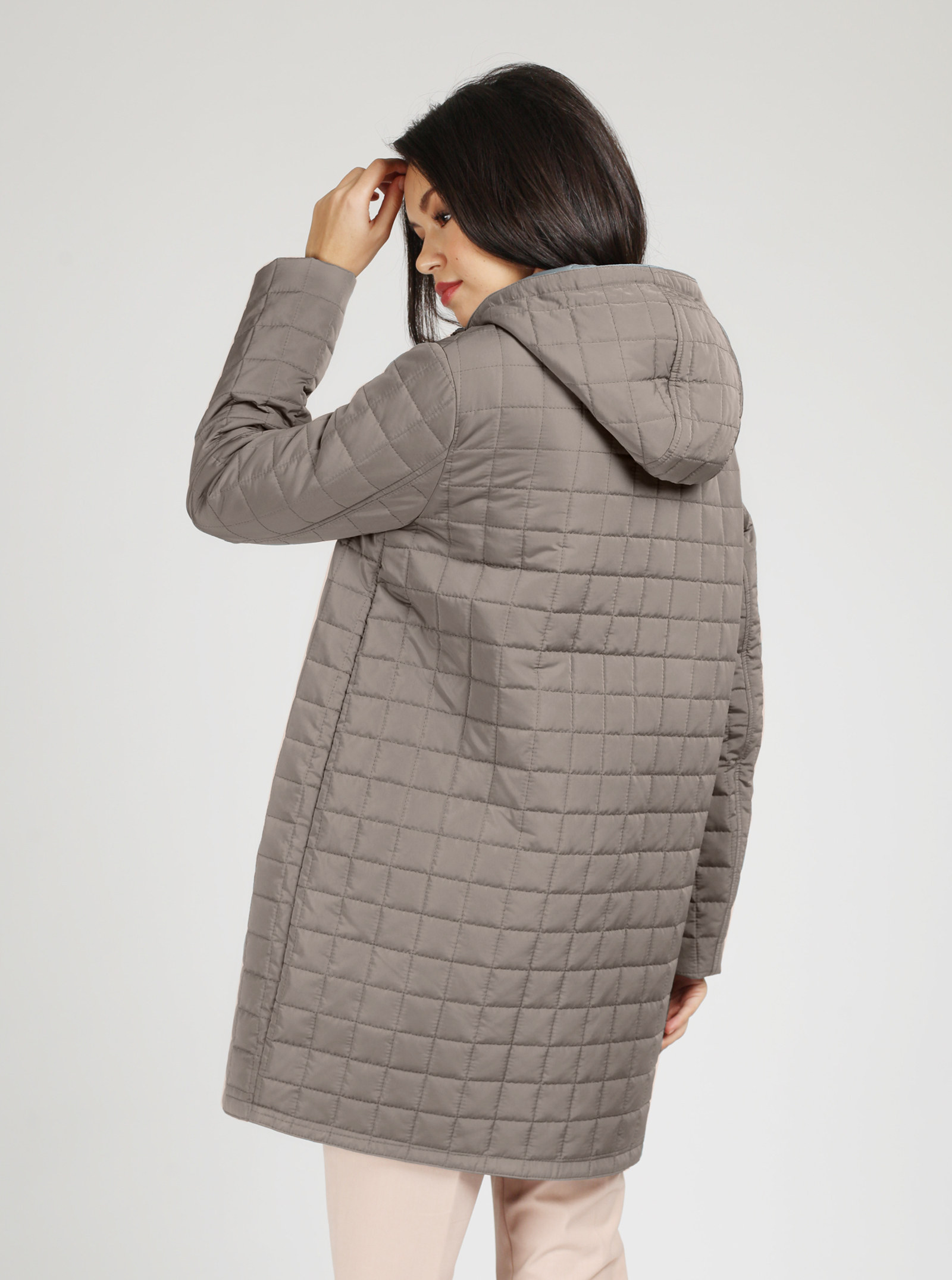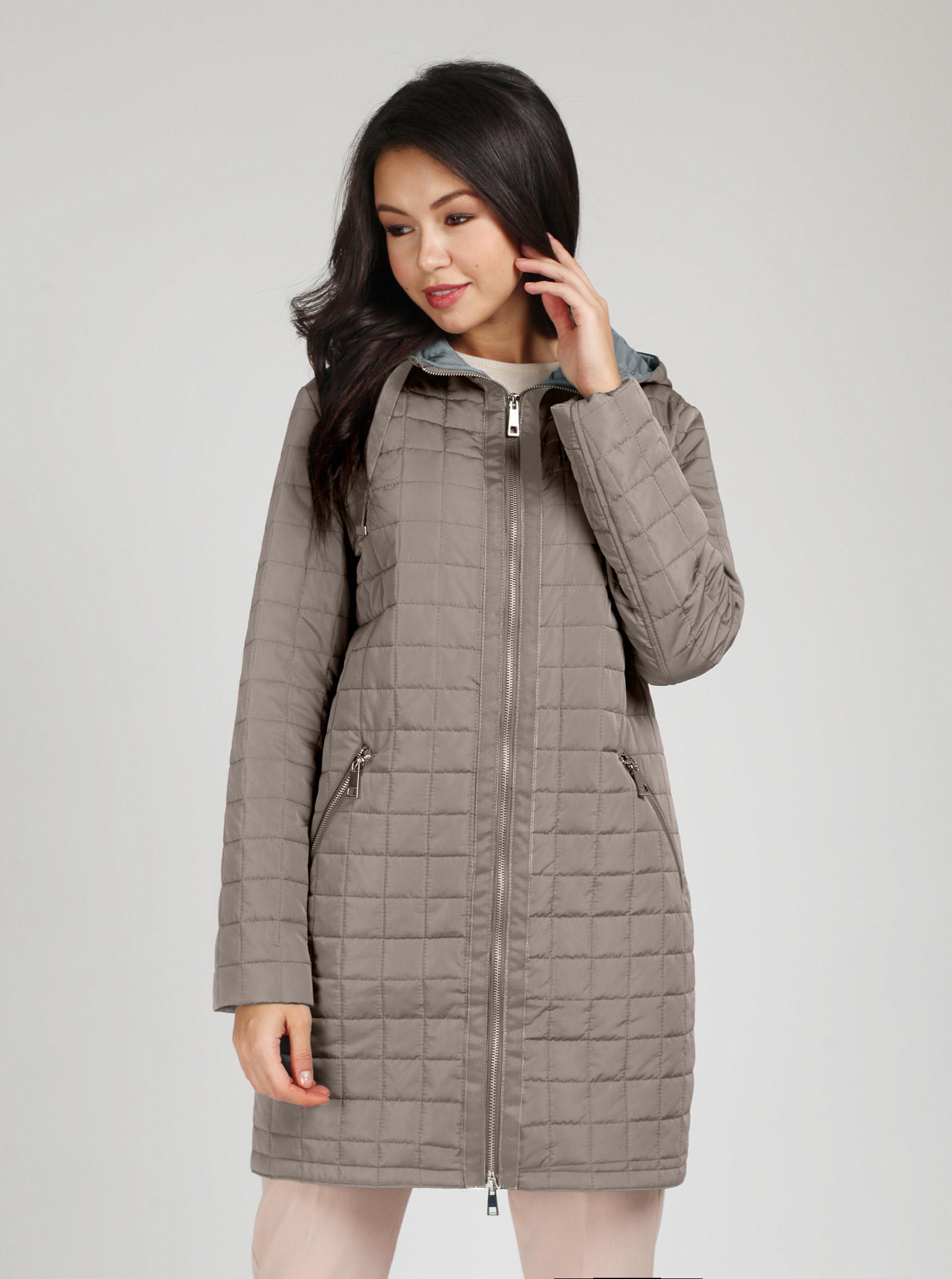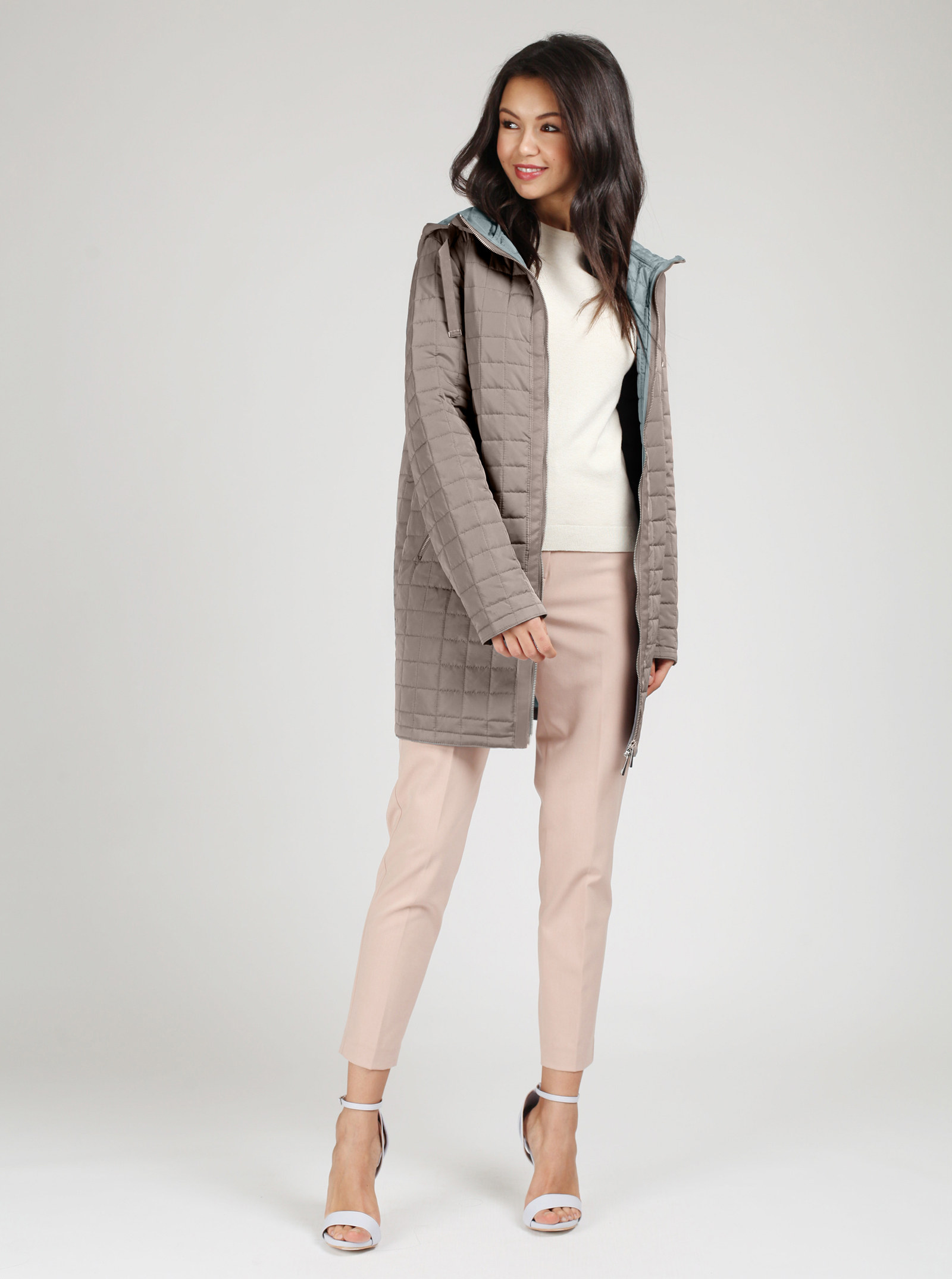 Демисезонное утепленное пальто из водоотталкивающей плащевой ткани прямого силуэта, простеганное насквозь рисунком "мелкий квадрат" Внутри и снаружи используются разные ткани по цвету и качеству, что в данной модели является доминантой. Контрастная отделка из репсовых лент делает изделие современным и привлекательным. Отвернув низ рукава в изделии появляется дополнительный акцент в виде декоративной отделки.