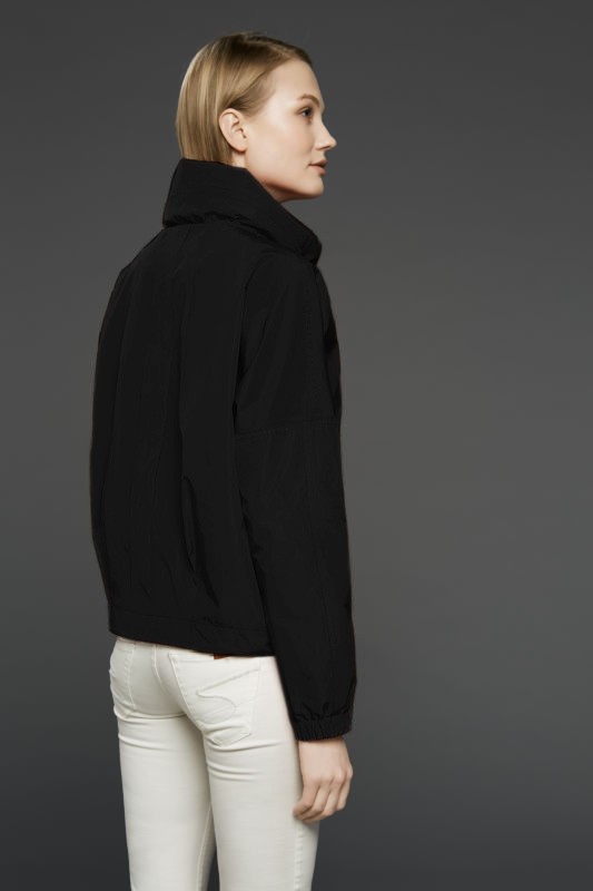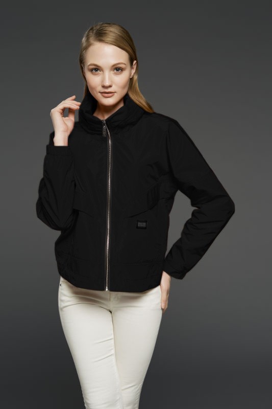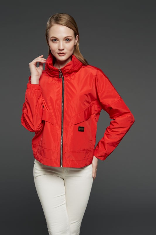 Укороченная, молодежная ветровка с красивым, широким воротником-стойкой и спрятанным капюшоном. Застежка -молния. Интересные, накладные карманы с фигурными клапанами.