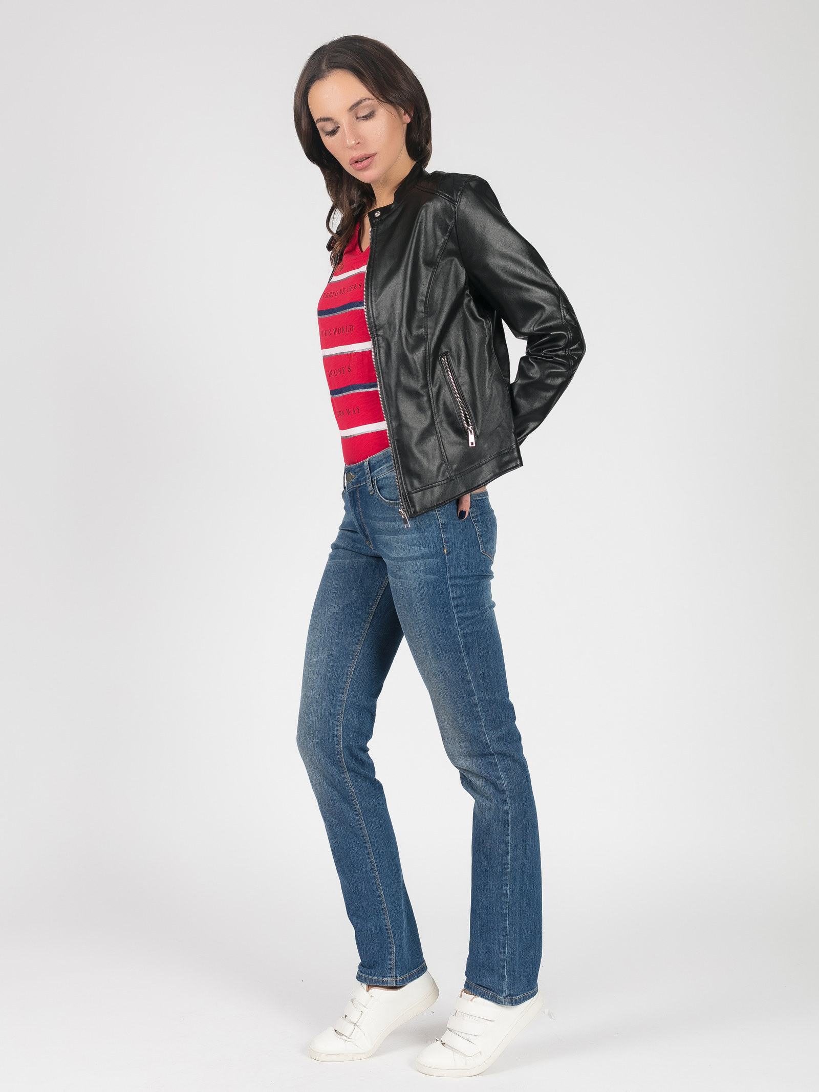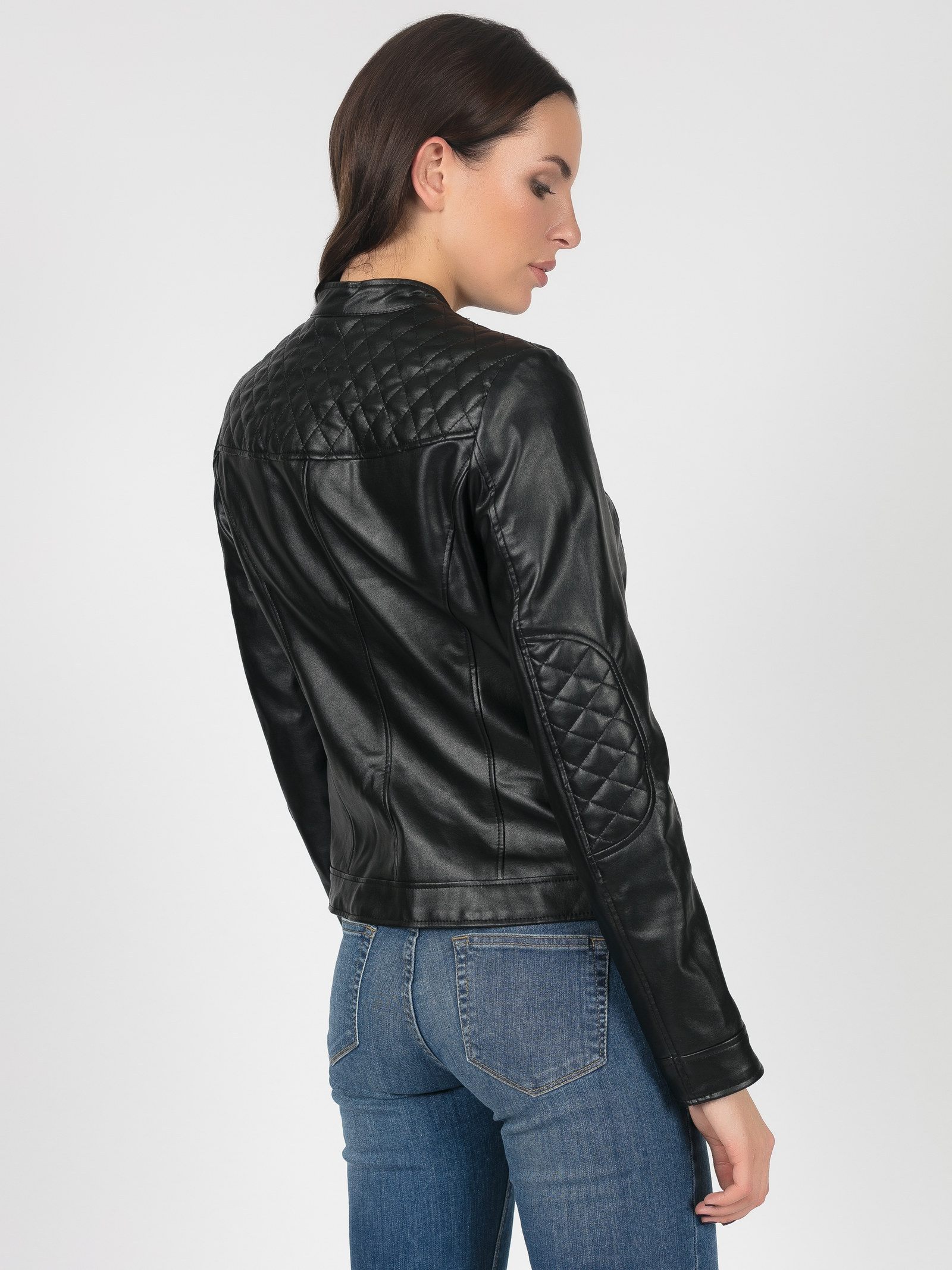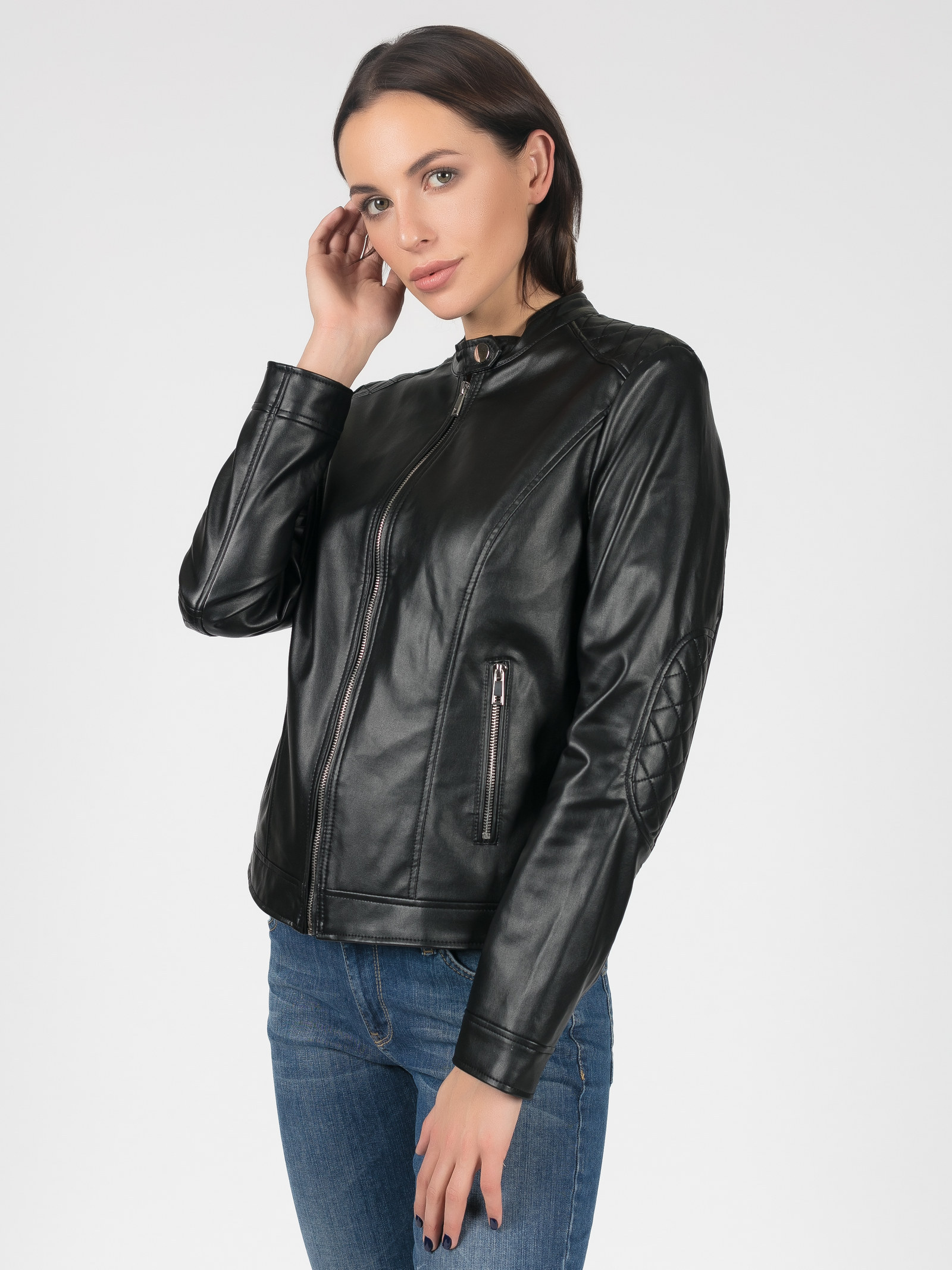 Короткая, модная куртка из эко кожи с декоративной отстрочкой на локтях, плечах и спинке. Центральная застежка на металличсекую молнию, два прорезных кармана. Рукава с регулируемыми манжетами на кнопках. Куртка в базовых тонах.