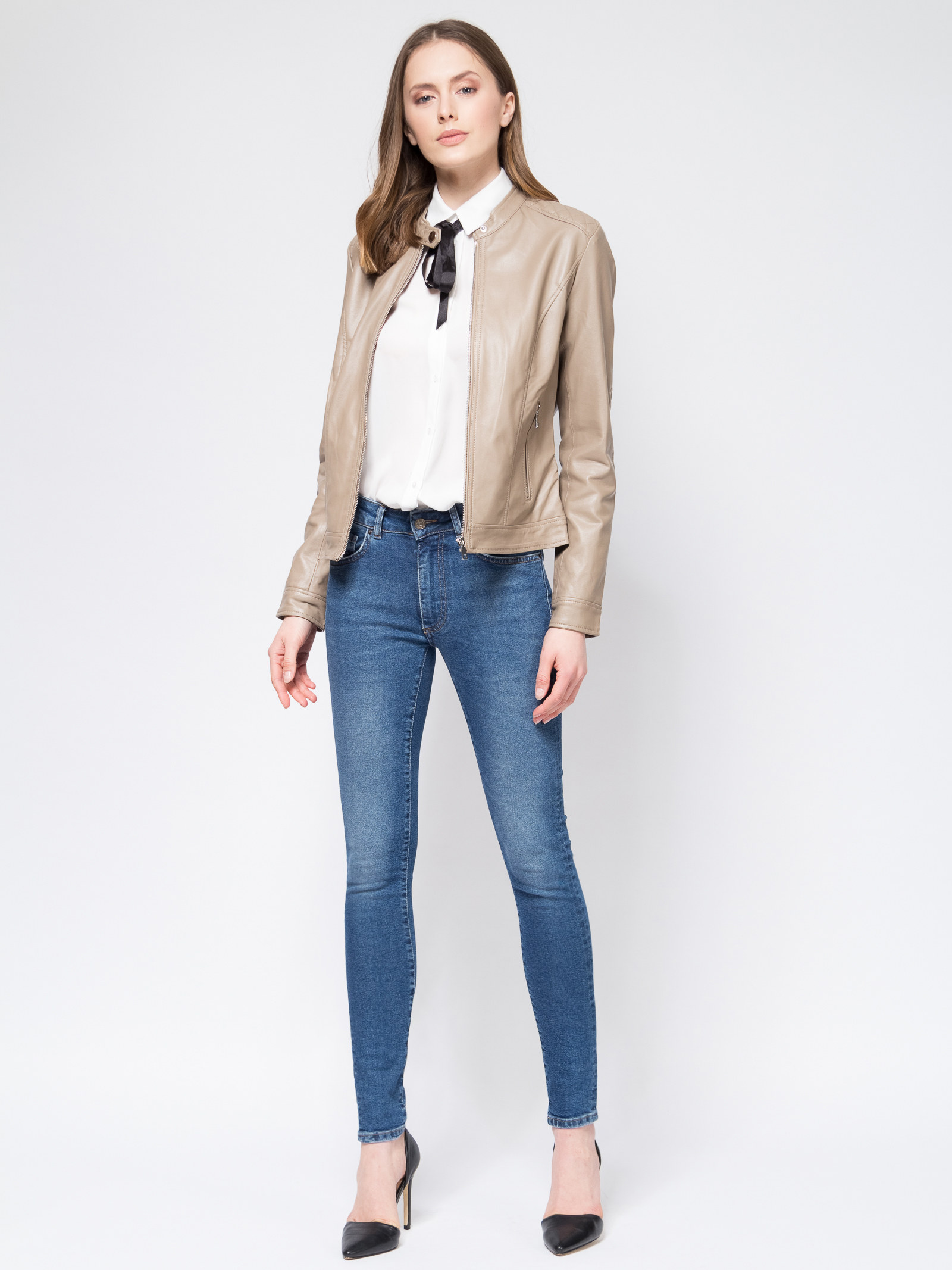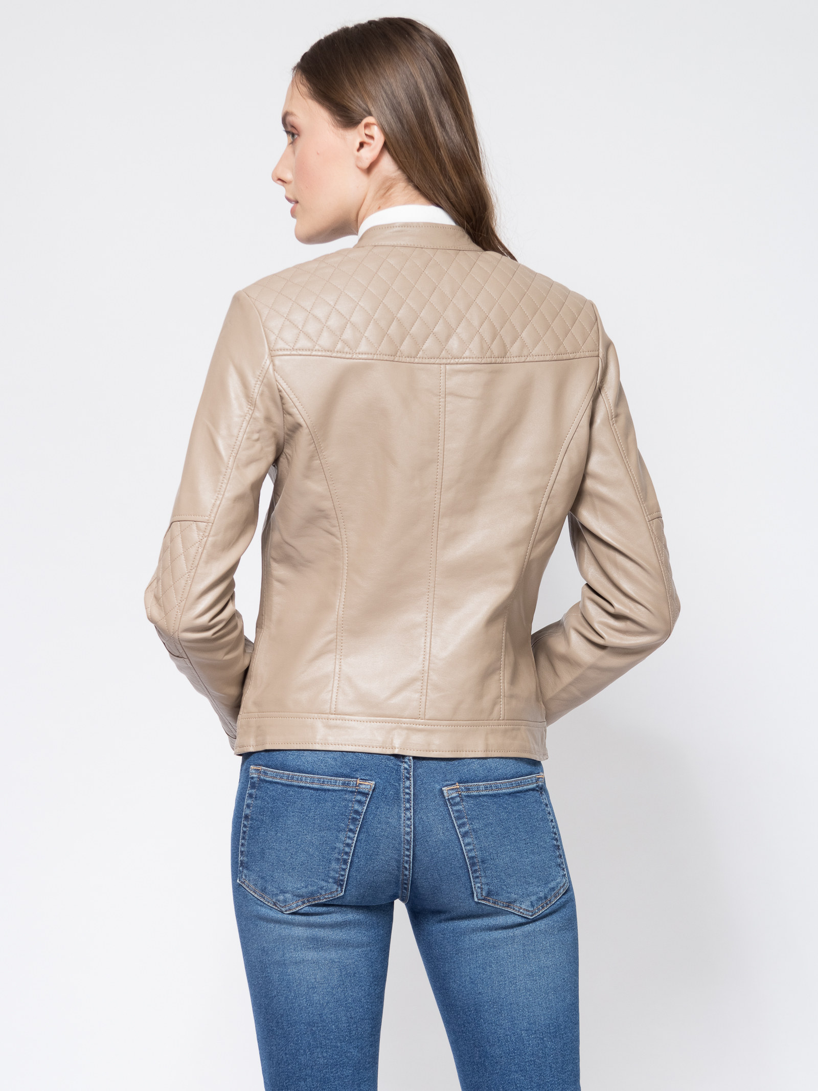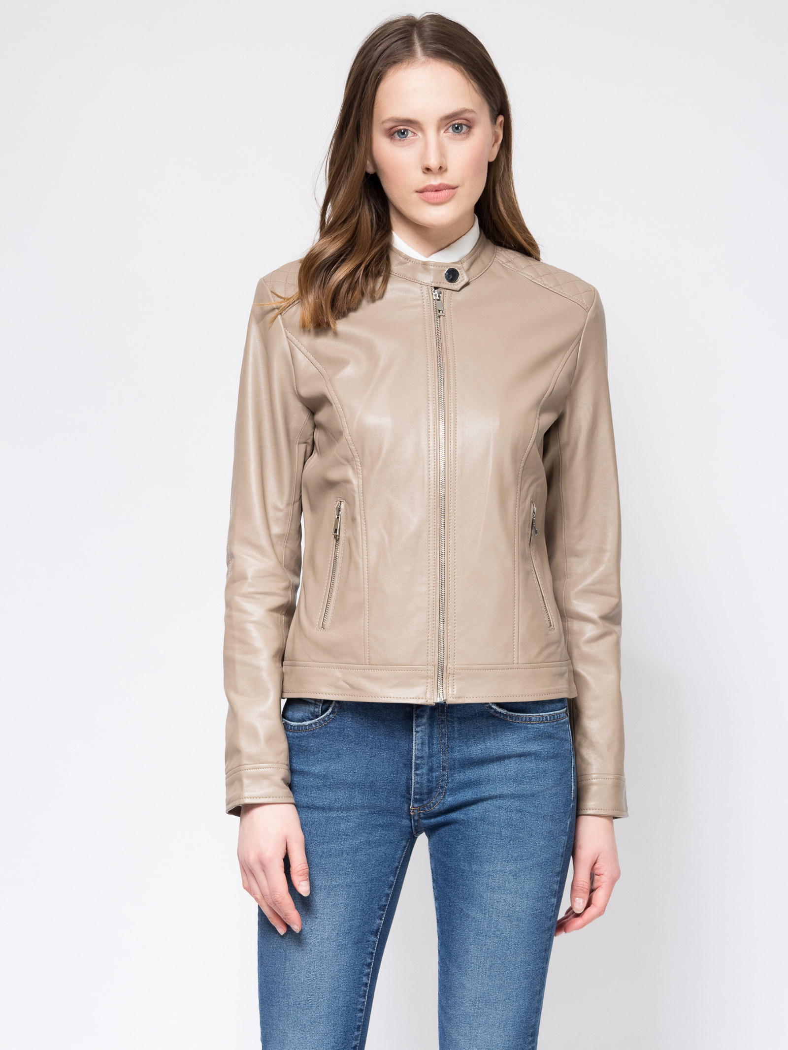 Короткая, модная куртка из эко кожи с декоративной отстрочкой на локтях, плечах и спинке. Центральная застежка на металличсекую молнию, два прорезных кармана. Рукава с регулируемыми манжетами на кнопках. Куртка в базовых тонах.