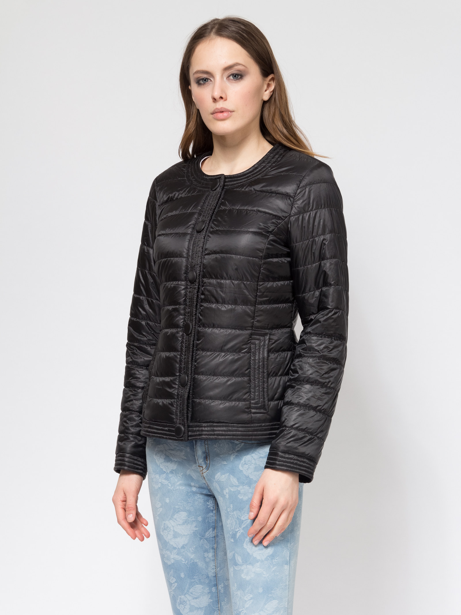 Элегантный, приталенный, стеганный жакет с открытой горловиной на крупных, красивых кнопках в тон. По бокам два кармана с листочками. Жакет подойдет как к брюкам, так и к юбке.