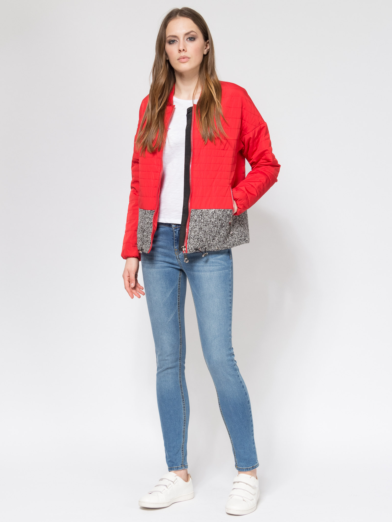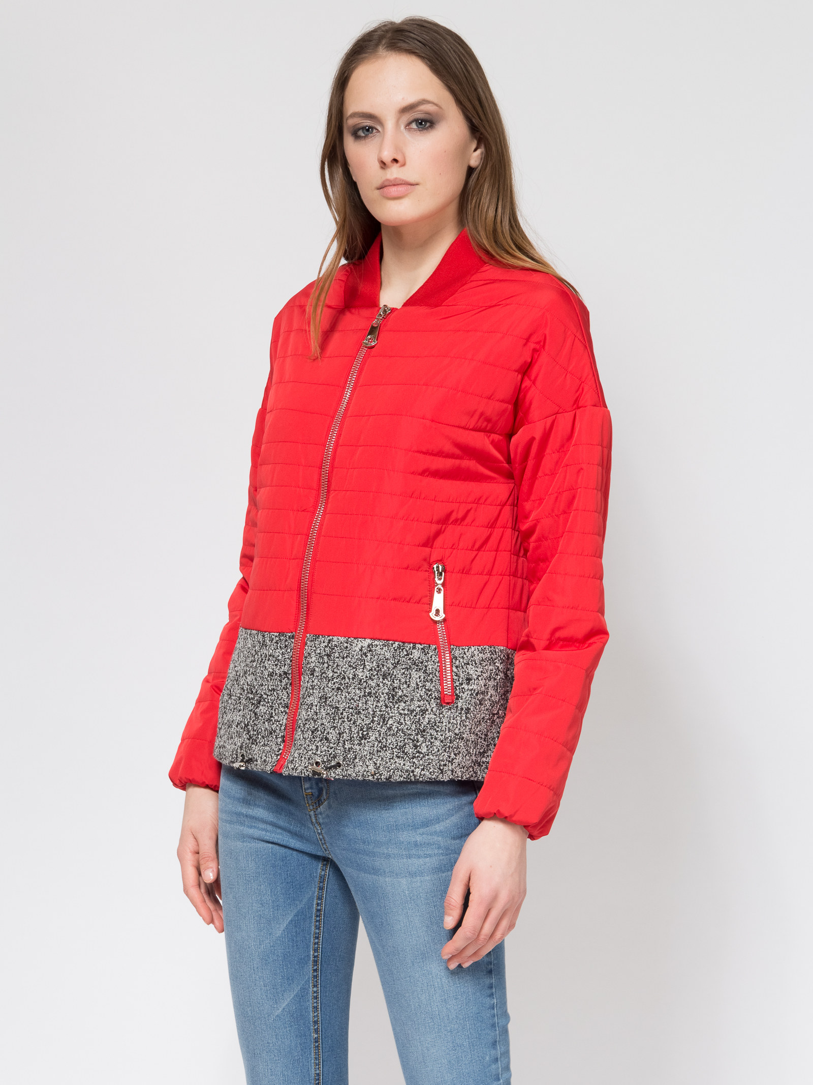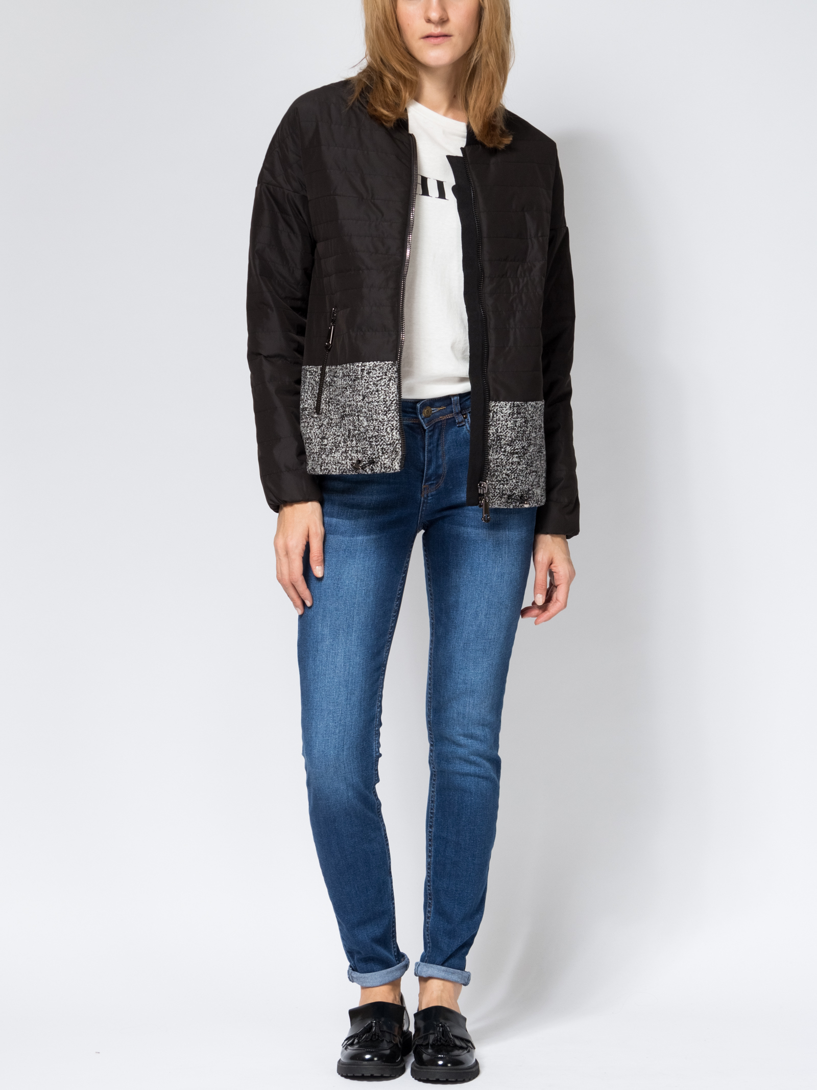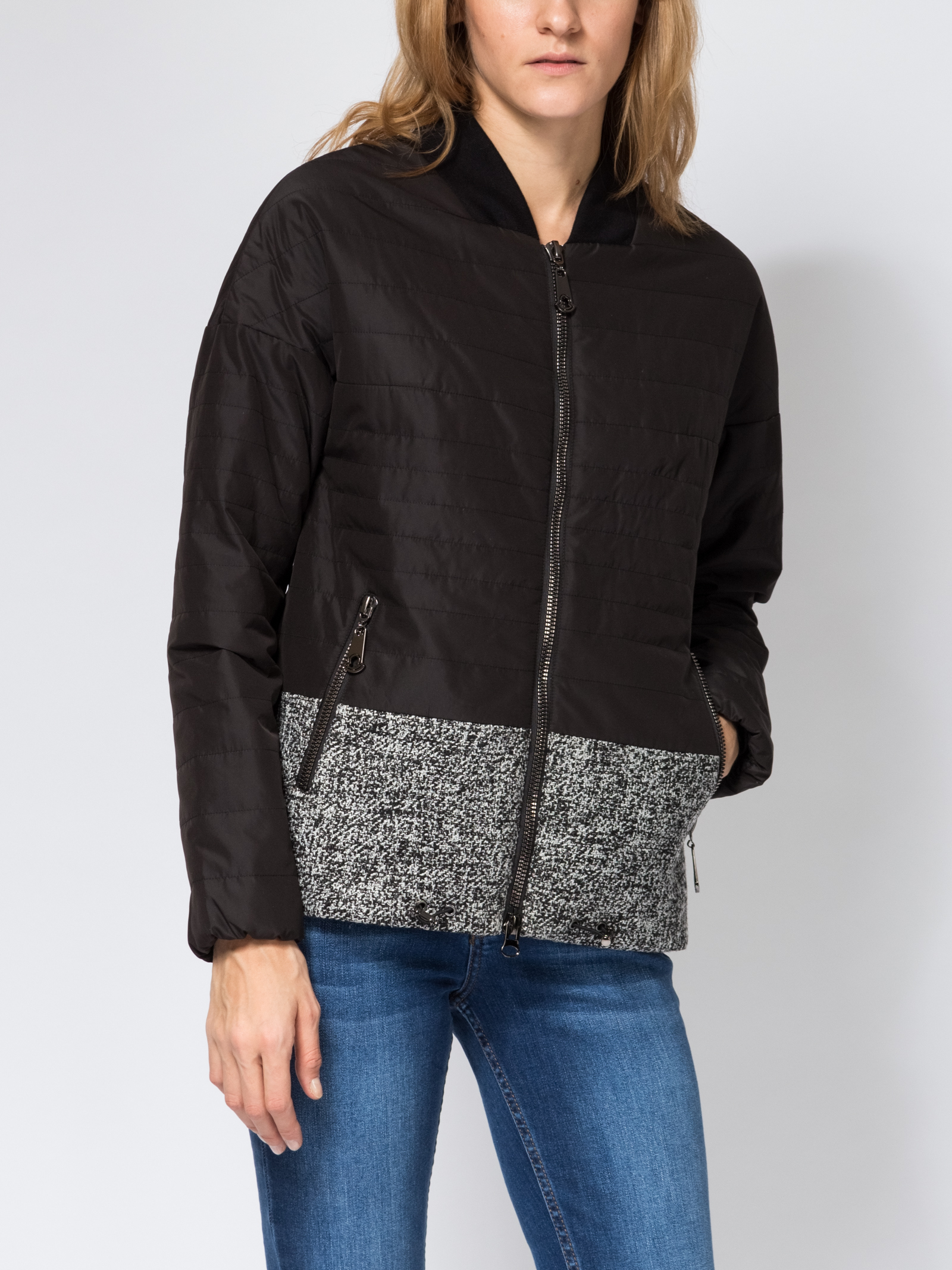 Короткая комбинированнная куртка с трикотажным воротником прямого силуэта. Куртка двухцветная, сочетает в себе два вида ткани. Застежка на широкую молнию с крупными аксессуарами. Боковые карманы на молниях. По низу регулируемая кулиска.
