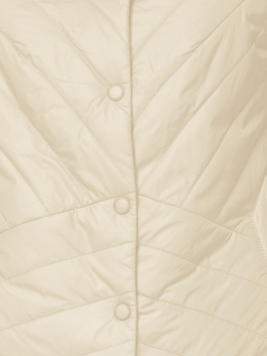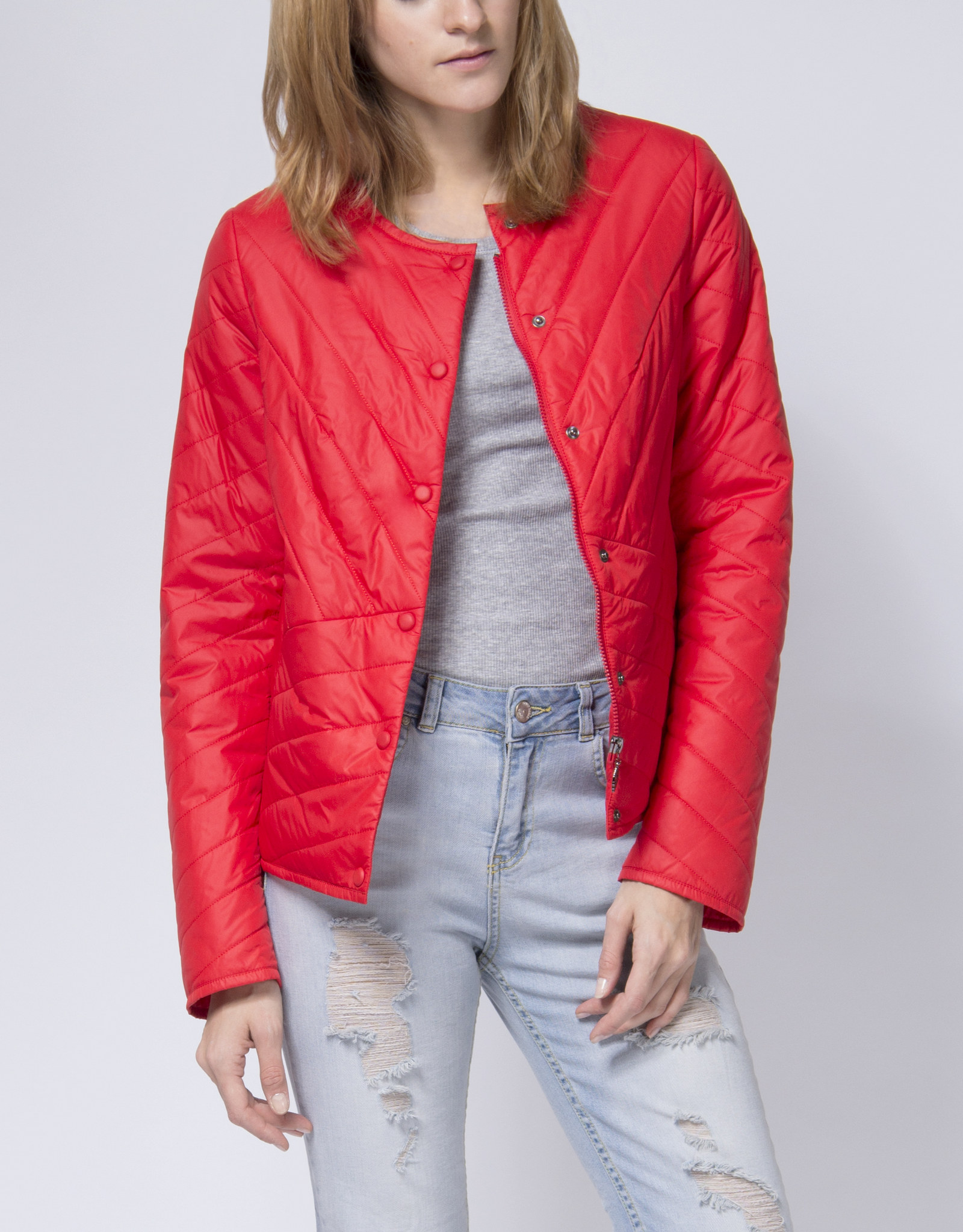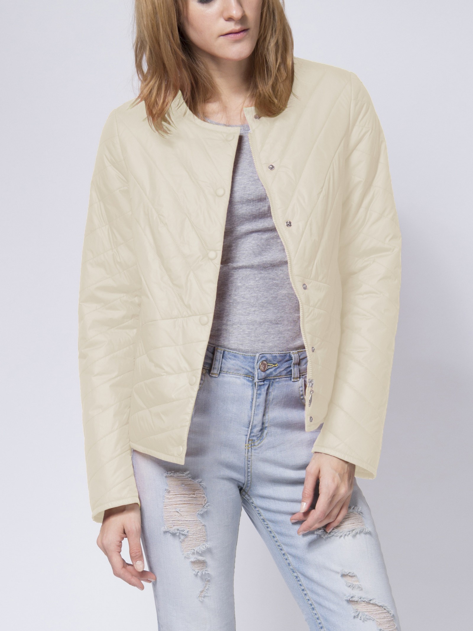 Короткая куртка на синтепоне прямого силуэта с открытой горловиной. Центральная застежка на кнопки в тон. Модель с интересной стежкой. Карманы с листочкой на кнопках.