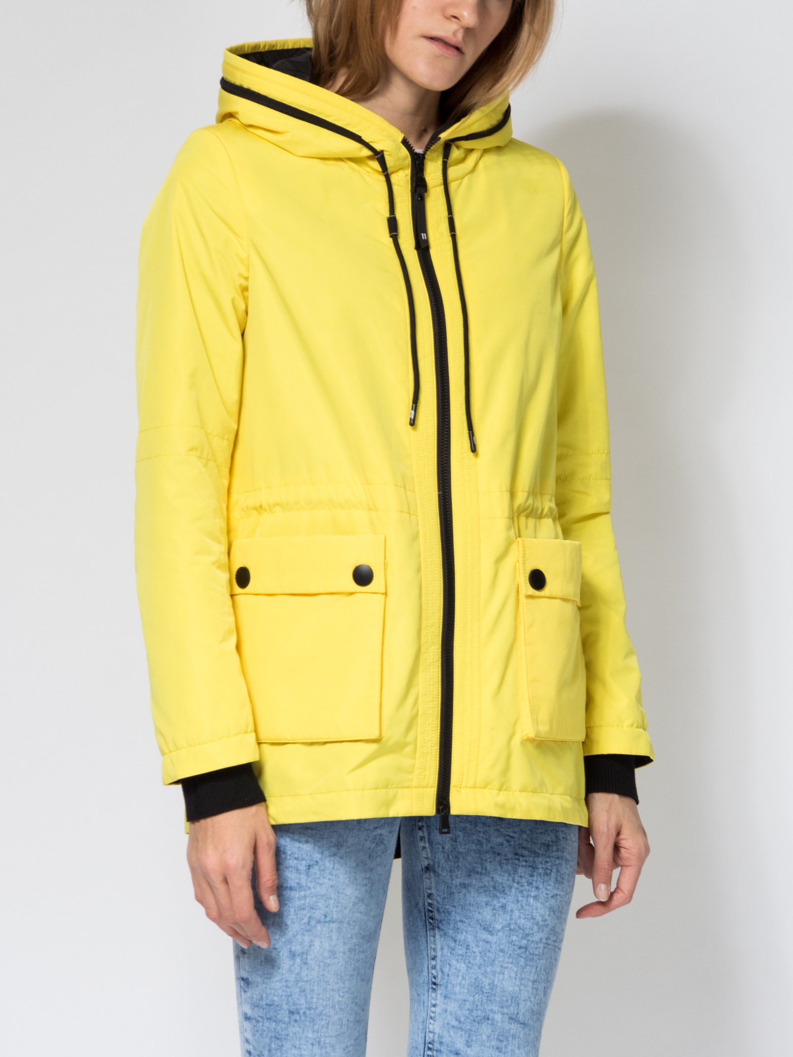 Молодежная куртка на синтепоне полуприлегающего силуэта с контрастной отделкой. Капюшон втачной с кулиской и широкими шнурами черного цвета. Центральная застежка-молния. По талии и низу внутренняя кулиска со шнуром. Рукав прямой с трикотажной манжетой. Карманы накладные с кнопками черного цвета.