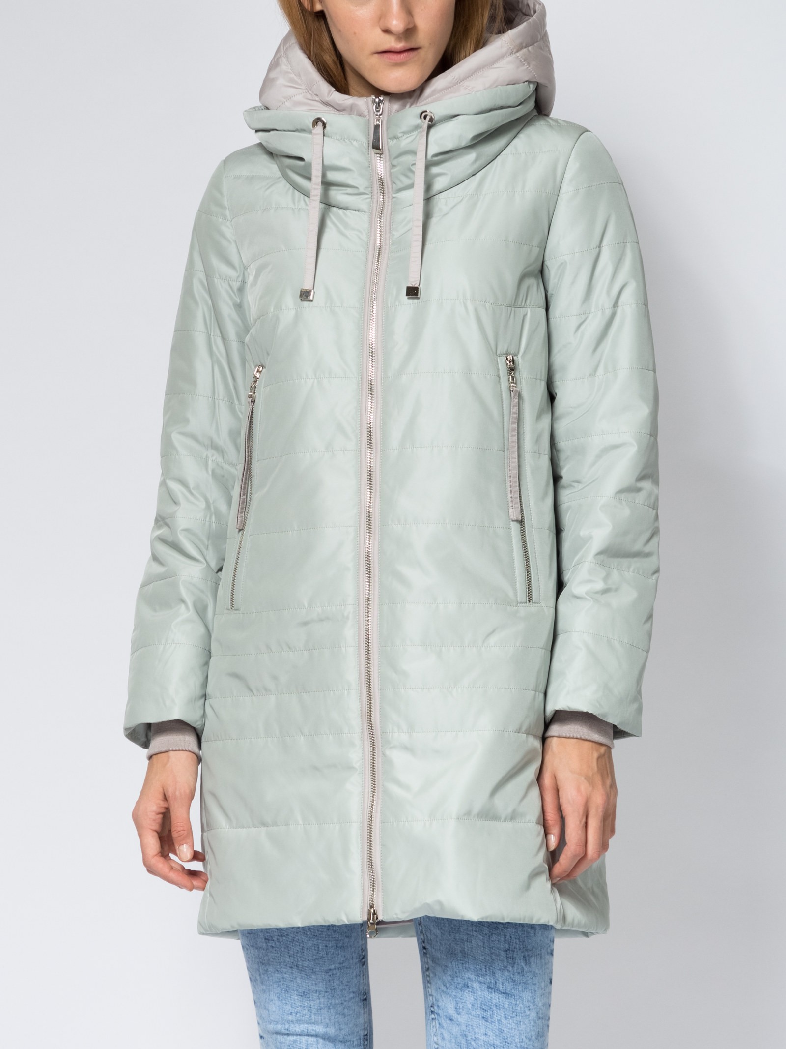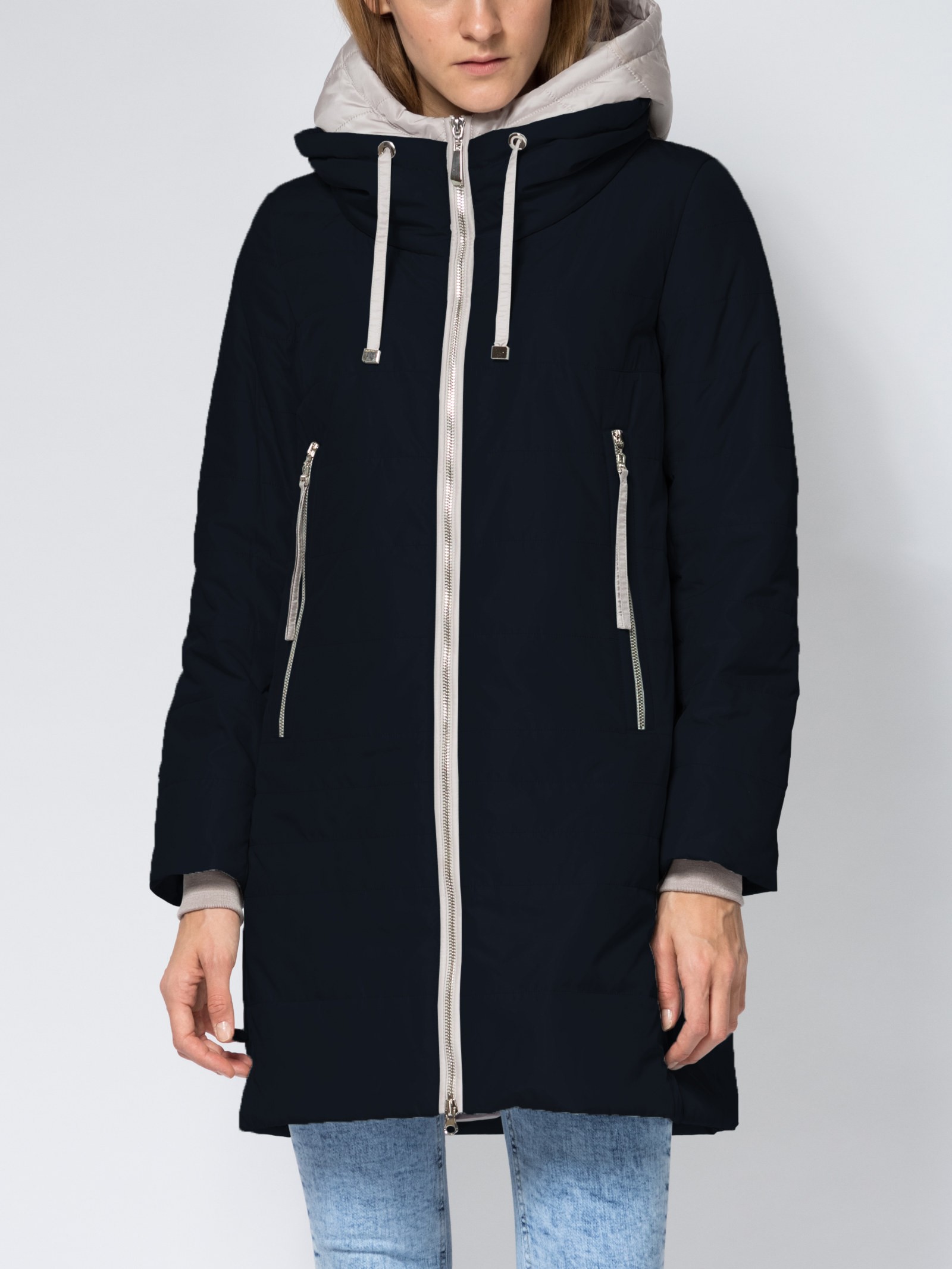Современная, удлиненная куртка"кокон" на синтепоне. Модель двухцветная, с котрасными деталями. Капюшон втачной. Воротник широкая стойка с тесьмой контрастного цвета. Удобная застежка молния с двойным бегунком. Карманы на молниях с крупным и красивым пуллером.