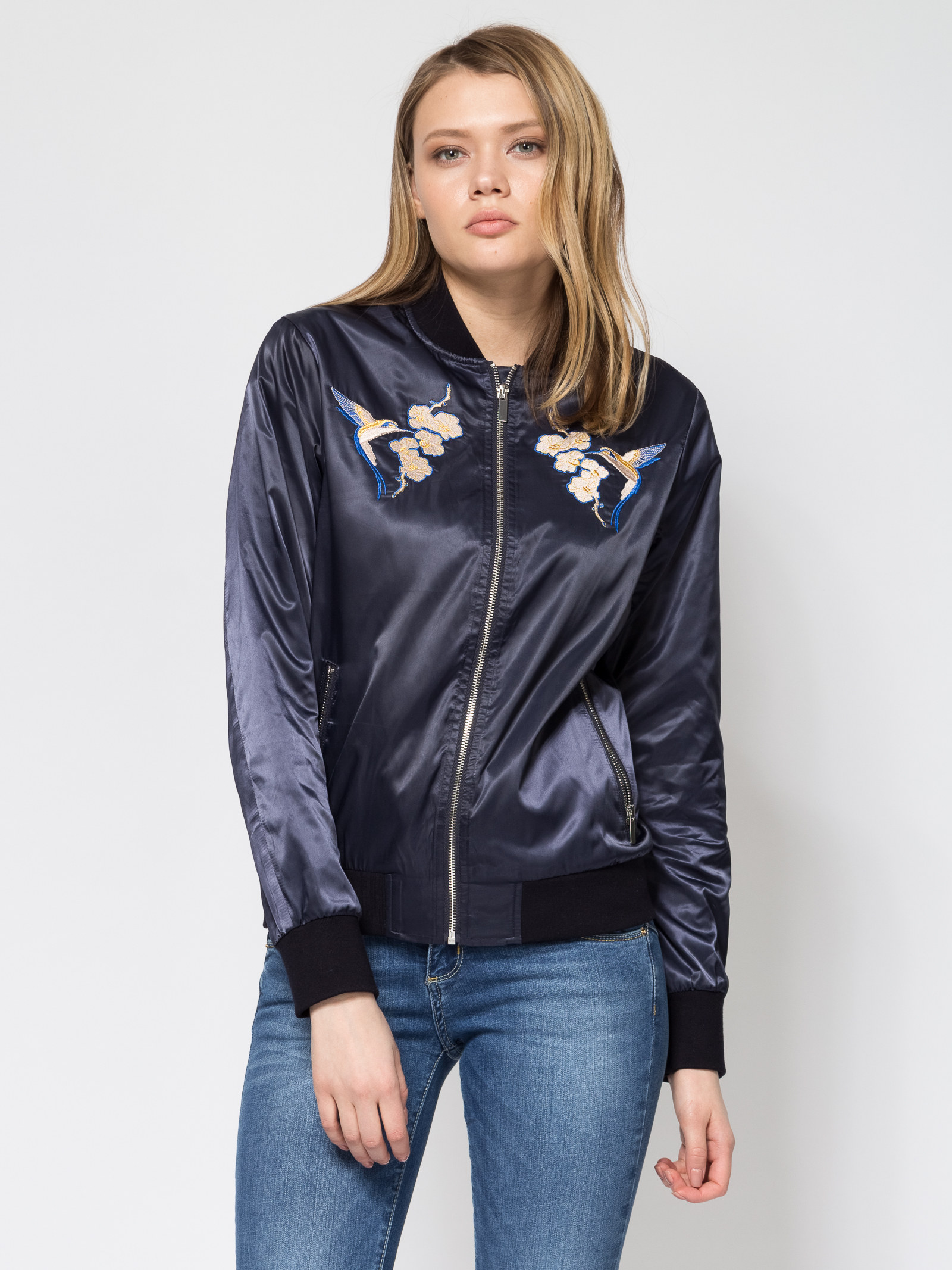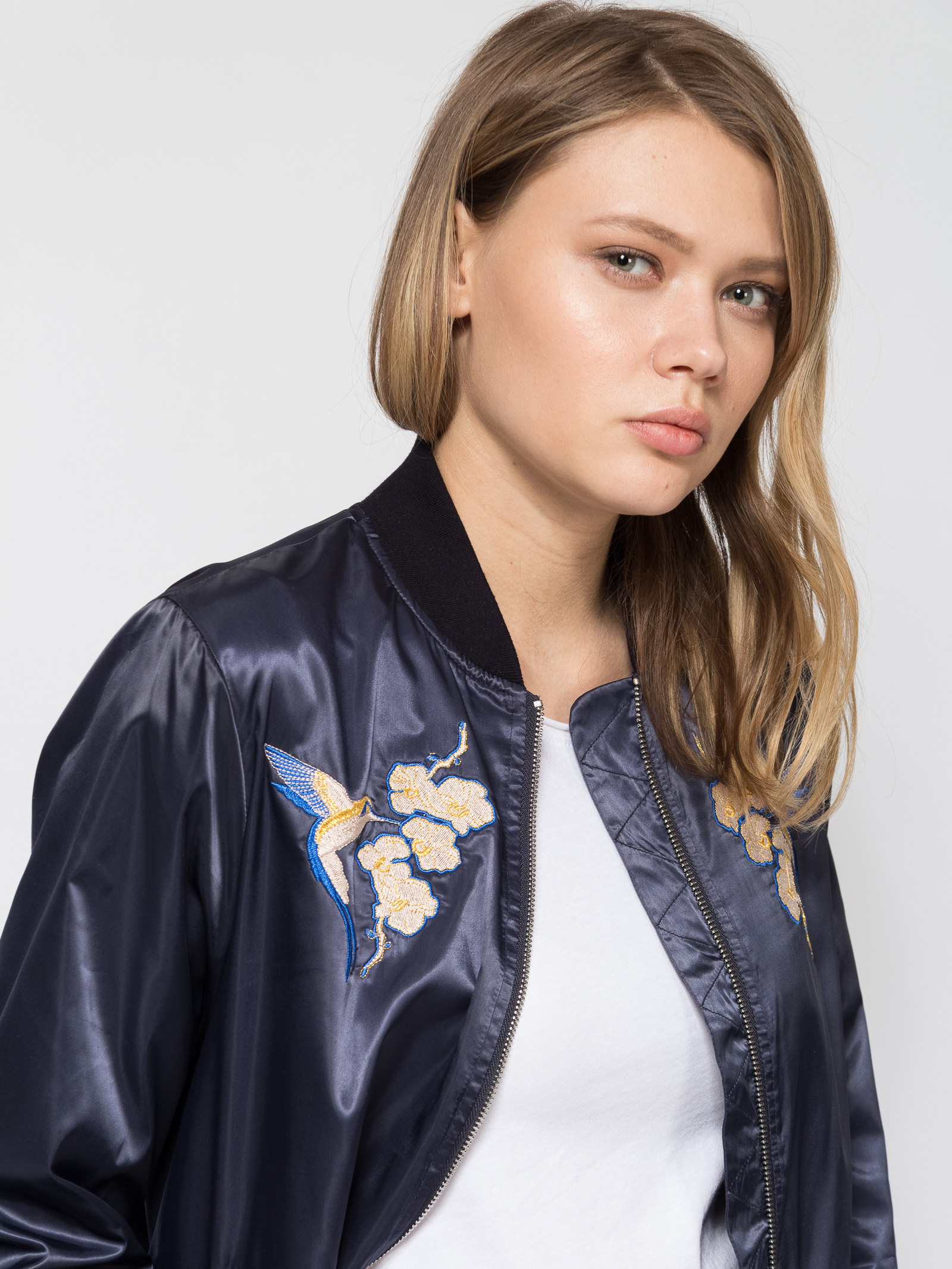 Куртка -бомбер из ткани с сатиновым эффектом и цветной вышивкой птицы на груди. Куртка с трикотажным воротником, манжетами и низом. Застежка- молния, два кармана на молниях по бокам.